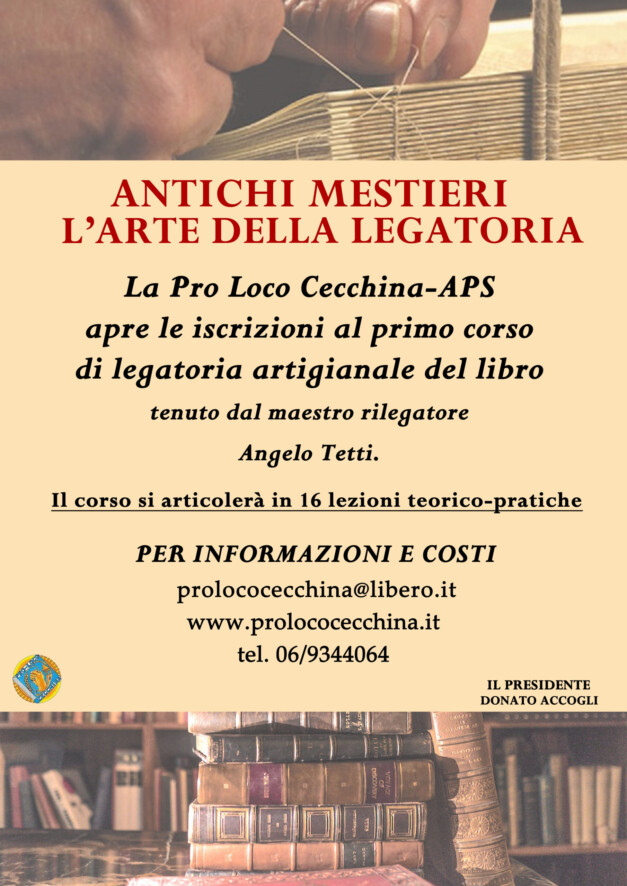 La Pro Loco Cecchina-APS, nell’ambito della valorizzazione degli antichi mestieri, avvia il corso “L’arte della legatoria”, tenuto dal maestro rilegatore Angelo Tetti. Attraverso un percorso di 16 lezioni teorico-pratiche imparerete a creare da voi libri, album e quaderni. Di seguito i dettagli del corso: Per partecipare al corso è necessario essere soci della Pro Loco Cecchina – APS. Gli interessati al corso non ancora soci avranno la possibilità di effettuare insieme entrambe le iscrizioni. PER INFORMAZIONI E COSTI:prolococecchina@libero.itwww.prolococecchina.ittel. 06/9344064