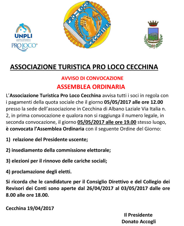 Il giorno 05/05/2017 alle ore 19.00 , è convocata l’Assemblea Ordinaria Scarica L’avviso.
