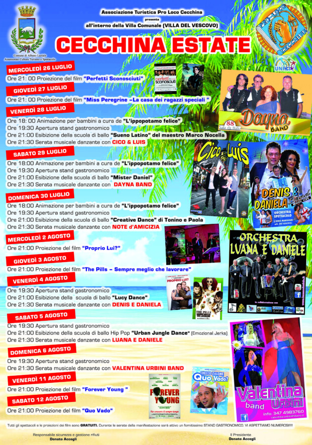 Ecco il programma di CECCHINA ESTATE 2017, DAL 26 LUGLIO all’interno di VILLA DEL VESCOVO. Quest’anno il nostro programma si è arricchito anche di una imperdibile rassegna cinematografica, oltre alle serate danzanti e alle esibizioni delle scuole di ballo del territorio. Il tutto sarà accompagnato da un fornitissimo STAND GASTRONOMICO. . Vi aspettiamo numerosi!! Scarica il Programma Completo