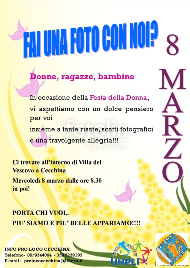 L’associazione turistica “PRO LOCO CECCHINA” presenta, in occasione della festa della donna, l’evento “Fai una foto con me”. Vi Aspettiamo Numerosi!! Scarica il Programma Completo