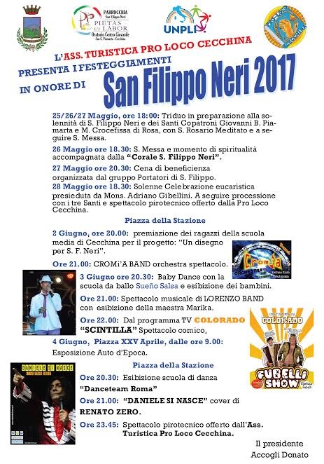 Festeggiamenti in onore di S. Filippo Neri 2017 Scarica il programma completo. Dal 29 maggio – Ore 12:35 al 4 giugno 2017