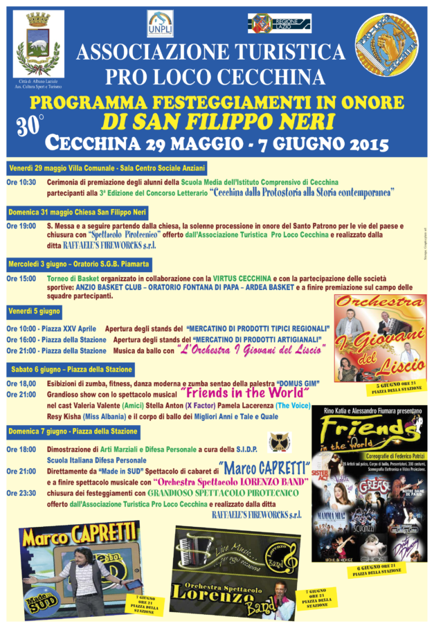 Programma festeggiamenti in onore di San Filippo Neri , 29 maggio – 7 giugno 2015. Scarica il programma completo.