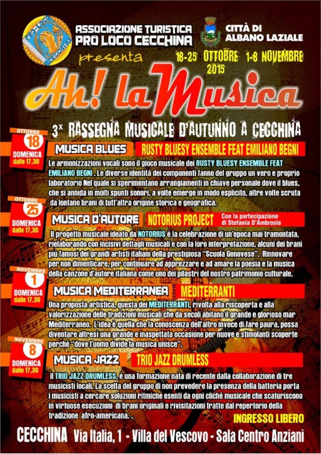 3a Rassegna Musicale Autunnale a Cecchina “Ah! La Musica” , si terrà a Cecchina da domenica 18 ottobre e per altre tre domeniche consecutive e fino a domenica 8 novembre. Scarica il programma completo.