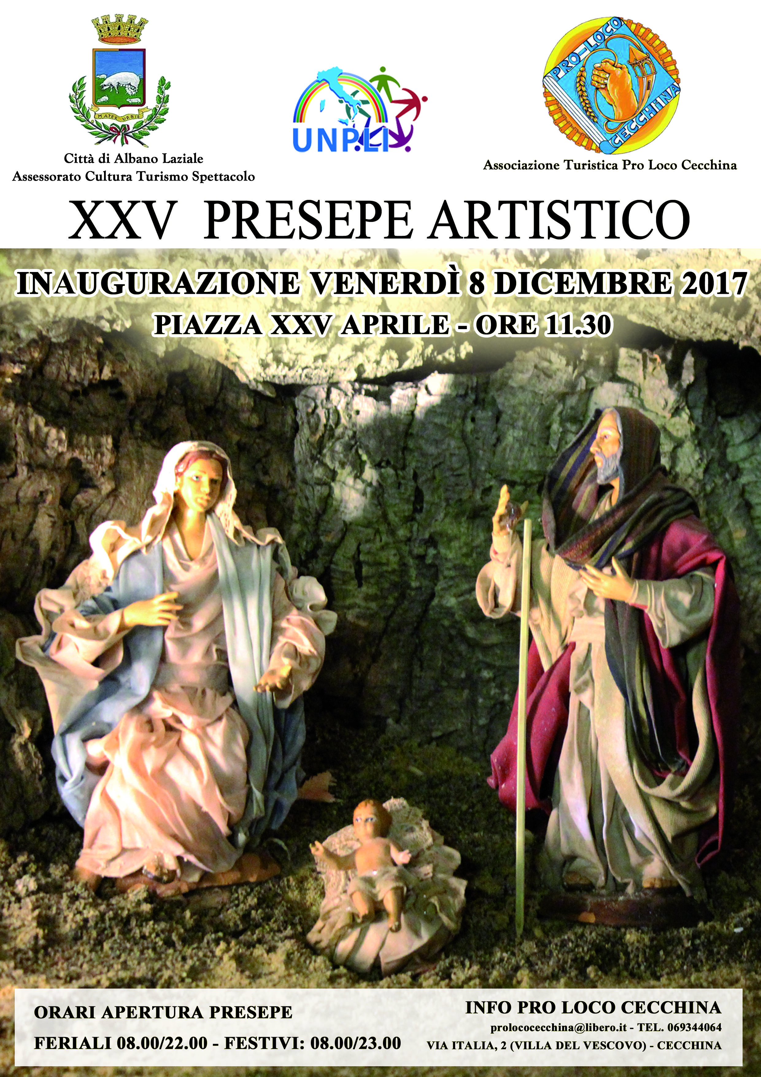 Quest’anno in occasione della realizzazione del 25° Presepe Artistico, l’ Associazione Turistica Pro Loco Cecchina ha voluto ampliare il programma dei festeggiamenti. Durante le prossime festività natalizie ci sarà da divertirsi tutti, grandi e piccini, con una serie di eventi che dureranno per tutto il mese di dicembre. Il programma avrà inizio l’8 dicembre con l’inaugurazione della 25ª edizione del Presepe Artistico e termineranno il 7 gennaio 2018 con un concerto del Complesso bandistico della Città di Albano “Cesare Durante”. Buon divertimento a tutti! Scarica il programma completo. Dall’ 8 dicembre – Ore 11:30 al 7 gennaio Ore 17:00